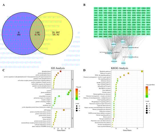 Functional Enrichment Analysis: The intersection genes of components and CNS disorders were uploaded to DAVID data (https://david.ncifcrf.gov/summary.jsp, accessed on 18 December 2024), with “OFFICIAL_GENE_SYMBOL” as the gene identifier and “Homo sapiens” as the species. DAVID 6.8 GO was applied to annotate the targets from three aspects: Biological Process (BP), Cellular Component (CC), and Molecular Function (MF). To elucidate the role of target points in signaling pathways, KEGG pathway enrichment analysis was conducted. The top 10 entries (p < 0.05) from GO analysis (BP, CC, MF) and the top 30 pathways (p < 0.05) from KEGG pathways were selected as the primary gene function enrichment processes and signaling pathways. To predict the mechanisms by which PMFs treat CNS diseases, a network was constructed that included brain-targeting components, key targets, and significant pathways.