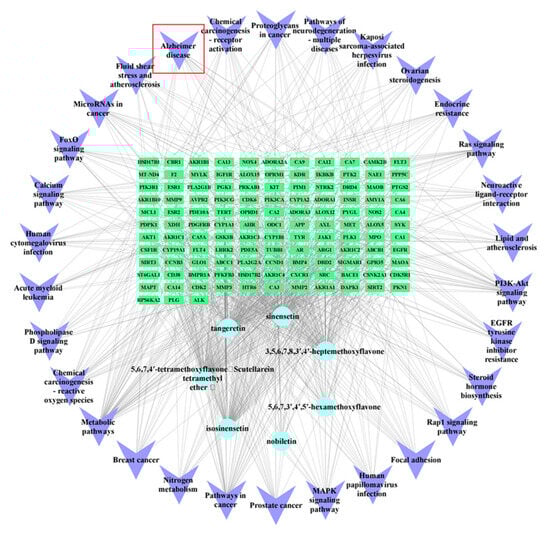 To conduct precise research on the relationship between PMFs and CNS disorders, seven PMFs identified in both brain tissue and CSF were used for network pharmacology analysis (Table 3). After removing repeated targets, 148 active targets of PMFs and 20,997 CNS disorder-related targets were collected. After processing by Venn diagram analysis, 148 targets were found to be common to both PMFs and CNS disease (Figure 2A). Cytoscape 3.8.2 software was used to construct a “components-targets” interaction network for describing the correspondence between PMFs and disease targets (Figure 2B). Based on the overlapping targets, Gene Ontology (GO) enrichment analysis was utilized to annotate the functions. The findings showed that numerous GO terms were enriched, and Figure 2C shows the top 10 significant terms in the biological processes (BP), molecular functions (MF), and cellular components (CC) categories. To delve deeper into the importance of the key targets, a Kyoto Encyclopedia of Genes and Genomes (KEGG) pathway enrichment analysis was performed. Figure 2D illustrates the top 30 pathways that were enriched by the KEGG pathway enrichment analysis. Based on the pathway enrichment analysis results, a network was constructed that included brain-targeting components, key targets, and significant pathways, with the objective of gaining a comprehensive understanding of the action mechanisms (Figure 3). The enriched pathways suggested that PMFs may intervene in CNS disorders through multiple pathways, including metabolism (such as metabolic pathways, nitrogen metabolism, steroid hormone biosynthesis, ovarian steroidogenesis), infection and immunity (such as human papillomavirus infection, Kaposi sarcoma-associated herpesvirus infection, human cytomegalovirus infection), and signal transduction (PI3K-Akt, MAPK, Rap1 signaling pathway, FoxO signaling pathway, phospholipase D signaling pathway, calcium signaling pathway, neuroactive ligand-receptor interaction). Moreover, the results revealed that neurodegenerative diseases and AD were highly enriched in the major KEGG pathways, suggesting that PMFs might possess potential activity for the prevention and treatment of neurodegenerative diseases, particularly for AD.