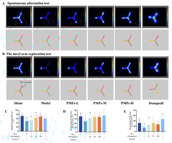 The experimental protocol is detailed in Figure 1. The cognitive function of mice was assessed using the Y-maze spontaneous alternation test and the novel arm exploration test [29,30]. Mice in the sham group displayed robust physical activity, high spontaneous alternation rates, and frequent novel arm entries, indicative of strong spatial memory and exploratory abilities. In contrast, the model group exhibited significantly lower spontaneous alternation rates compared to the sham group (p < 0.001, Figure 4A,C). The high-dose PMFs group and the positive drug control group, however, exhibited a significant improvement in spontaneous alternation rates compared to the model group (p < 0.001, and p < 0.05, respectively). During the novel arm exploration test, the model group exhibited a significant reduction in percentage of entries into the novel arm compared to the sham group (p < 0.05, Figure 4B,D). Both the middle- and high-dose PMFs group, as well as the positive drug group, showed a significant increase in the percentage of entries into novel arm compared to the model group (p < 0.05, p < 0.05, and p < 0.01, respectively). Additionally, the model group exhibited a significant decrease in percentage of time spent in the novel arm (p < 0.05, Figure 4B,E), i.e., the effect that was reversed by the middle- and high-dose PMFs groups, as well as the positive drug control group (p < 0.05, p < 0.05, and p < 0.001, respectively).