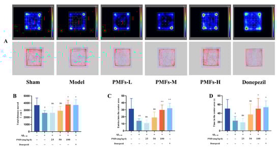 The Open Field test was used to assess exploratory, locomotor, and anxiety-like behaviors in mice [31]. Mice in the sham group displayed robust physical activity, frequent entries into the central area, and a prolonged cumulative duration there, indicative of strong exploratory behavior and a healthy mental state. In contrast, the model group showed significant reductions in the total distance moved, the frequency of entries into the central area, and the time spent exploring the central area compared to the sham group (p < 0.05, p < 0.01, and p < 0.05, respectively) (Figure 5). The high-dose PMFs and positive drug groups showed significantly improved behavioral abnormalities in AD-like mice, as Figure 5 shows.