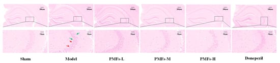 The accumulation of Aβ leads to neuronal damage or death, ultimately causing cognitive dysfunction [32]. To assess histological alterations in hippocampal neurons, we utilized hematoxylin and eosin (HE) staining. In the sham group, neurons in the hippocampal CA3 region appeared neatly arranged with normal morphology, and no significant nuclear pyknosis was observed (Figure 6). In contrast, the model group displayed pronounced nuclear pyknosis, disarrayed arrangement, and enlarged neuronal gap. Treatment with PMFs and donepezil, however, mitigated these histological abnormalities, restoring the normal structure and arrangement of neurons in the hippocampal CA3 region.