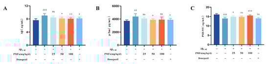 The Aβ deposition and Tau hyper-phosphorylation are the core pathological hallmark of AD [33]. This study evaluated changes in Aβ and p-Tau levels in brain tissue using the ELISA method. The levels of Aβ and p-Tau in the model group were significantly elevated compared to those in the sham group (p < 0.001 and p < 0.01, respectively) (Figure 7A,B). Both the middle- and high-dose PMFs groups, as well as the positive drug group, exhibited a significant reduction in Aβ levels compared to the model group (p < 0.05, p < 0.01, and p < 0.05, respectively). Similarly, the middle-dose PMFs and positive drug groups significantly decreased p-Tau levels versus the model group (both p < 0.05).