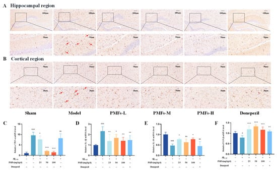 Neuroinflammation has been recognized as a pivotal factor in the pathogenesis of AD. Microglia, macrophage-like innate immune cells in the CNS, play a crucial role in neuroinflammation [35]. Immunohistochemistry was employed to assess the quantity and morphology of microglia in the brain. The results illustrated that in the sham group, microglia predominantly displayed a resting morphology with small cell bodies and multiple branches (Figure 8A,B). In contrast, the model group featured activated microglia with enlarged cell bodies and swollen short branches. Compared to the model group, PMF treatment significantly reversed microglial activation in the hippocampal and cortical regions, while donepezil had a less pronounced effect. Additionally, RT-qPCR was employed to assess the expression of inflammatory factors. The results showed that the relative mRNA levels of the pro-inflammatory factors TNF-α and IL-1β in the model group significantly increased compared to those in the sham group (both, p < 0.001) (Figure 8C,D). PMFs effectively mitigated these changes, reducing the expression of TNF-α and IL-1β. Meanwhile, the gene expression of anti-inflammatory factors IL-10 and TGF-β in the model group was significantly lower compared to the sham group (p < 0.001 and p < 0.05, respectively) (Figure 8E,F). Treatment with low- and high-dose PMFs significantly increased IL-10 expression compared to the model group (both, p < 0.05), with all PMF doses reversing the decrease in TGF-β expression (both, p < 0.001). By contrast, donepezil exhibited a weaker inhibitory effect, only significantly decreasing the expression of IL-1 (p < 0.01) and increasing the expression of TGF-β (p < 0.01).