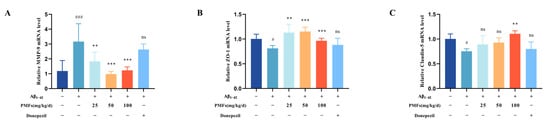 BBB dysfunction and neuroinflammation interact synergistically, creating a vicious cycle that accelerates the progression of AD [36]. Therefore, we further evaluated the functionality of BBB. RT-qPCR assay showed that the relative mRNA level of matrix metalloproteinase-9 (MMP-9) in the model group was significantly higher than that in the sham group (p < 0.001) (Figure 9A). All PMF intervention groups exhibited a significant reduction of MMP-9 levels compared to the model group (p < 0.01, p < 0.001, and p < 0.001, respectively). Furthermore, we examined the levels of tight junction protein closely related to BBB integrity. The results showed that the levels of Zonula Occludens-1 (ZO-1) and Claudin-5 in the model group were significantly reduced compared to those in the sham group (both, p < 0.05) (Figure 9B,C). All groups treated with PMFs showed a significant elevation in ZO-1 levels compared to the model group (p < 0.01, p < 0.001, and p < 0.001, respectively). Moreover, the high-dose PMF intervention group significantly reversed the decrease in Claudin-5 levels observed in the model group (p < 0.001).