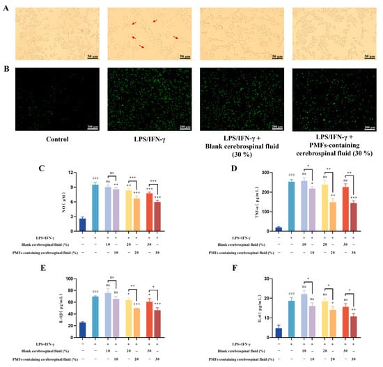Subsequently, we investigated the effect of PMF-containing CSF on the LPS/IFN-γ-induced inflammation in BV2 cells. First, the cell morphology was observed under a microscope. As Figure 10A shows, BV2 cells in the control group, under resting conditions, exhibited small cell bodies with a round shape (suspended state) or an epithelial-like morphology with 2–3 pseudopodia (adherent state). In contrast, after stimulation with LPS/IFN-γ, the cells transitioned from a resting to an activated state, characterized by an enlarged cell body, an increase in the proportion of adherent cells, a decrease in pseudopodia or the formation of filopodia, and the manifestation of an amoeboid morphology. However, PMF-containing CSF effectively mitigated these changes, reducing the proportion of activated cells. Subsequently, we measured intracellular ROS levels, which were significantly increased by LPS/IFN-γ stimulation (Figure 10B). The increase in ROS levels was attenuated by the PMF-containing CSF, restoring them to normal levels. Furthermore, the assay results indicated that the NO content was significantly higher in the LPS/IFN-γ group compared to the control group (p < 0.001) (Figure 10C). Treatment with 20% and 30% PMF-containing CSF significantly reduced NO levels compared to both the LPS/IFN-γ group and the corresponding blank CSF group (p < 0.001). Notably, 20% and 30% blank CSF also demonstrated an inhibitory effect on NO production induced by LPS/IFN-γ (p < 0.01). In addition, the levels of pro-inflammatory cytokines TNF-α, IL-1β, and IL-6 were measured to evaluate the anti-inflammatory effects. The ELISA results showed that the content of TNF-α, IL-1β, and IL-6 in BV2 cells were significantly increased in response to LPS/IFN-γ stimulation (p < 0.001). Compared to the LPS/IFN-γ group and the corresponding blank CSF group, treatment with 20% and 30% PMF-containing CSF significantly reversed the increased levels of TNF-α, IL-1β, and IL-6 (Figure 10D–F). As with NO, the groups treated with 20% and 30% blank CSF also significantly attenuated the LPS/IFN-γ-induced increase in IL-1β production (p < 0.05). Overall, the detection results indicated that PMFs effectively mitigate the inflammatory response induced by LPS/IFN-γ in BV2 microglial cells. Notably, the blank CSF also demonstrated an anti-inflammatory trend, in line with the findings that healthy CSF exerted a protective effect on the brain [37].