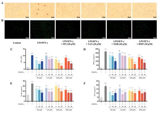 To screen for potent bioactive monomers, we further investigated the efficacy of four monomers that were identified in both brain tissue and CSF: sinensetin (SIN), tangeretin (TAN), nobiletin (NOB), and 3,5,6,7,8,3′,4′-heptamethoxyflavone (HMF). First, we tested the effects of different concentrations of monomers on cell viability. The results indicated that, at concentrations of 20 μM or lower, all monomers had no significant effect on the viability of BV2 cells. Consequently, concentrations of 5, 10, and 20 μM were chosen for further experimental investigations. Subsequently, the cells were observed under an optical microscope to assess the changes in morphology after treatment with respective groups. Four monomers effectively inhibited the activation of microglia induced by LPS/IFN-γ (Figure 11A). We proceeded to examine their potential capability for scavenging ROS. Four monomers reduced the levels of intracellular ROS compared to the LPS/IFN-γ group (Figure 11B). Moreover, the indicators of inflammation, including NO, TNF-α, IL-1β, and IL-6, were also investigated. Compared with the LPS/IFN-γ group, four monomers reduced the content of NO, and the inhibitory effect was dose-dependent in the group of NOB and HMF (Figure 11C). By contrast, TAN exhibited a weaker inhibitory effect, displaying no significant impact at a concentration of 5 μM. Additionally, four monomers inhibited the production of TNF-α in a dose-dependent manner (Figure 11D). Similarly, four monomers caused the inhibition of the LPS/IFN-γ-induced increase in IL-1β and IL-6 production (Figure 11E,F). In conclusion, both SIN, TAN, NOB, and HMF showed potential anti-neuroinflammatory activity.