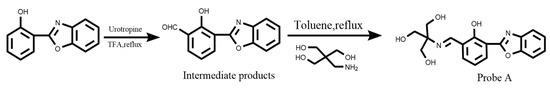 Synthesis method for probe A. The following reagents were weighed and subsequently reacted at 80 °C for 5 h: 0.844 g of 2-(2-hydroxyphenyl)benzoxazole, 20 mL of trifluoroacetic acid, and 2.800 g of hexamethylenetetramine. Subsequently, 0.238 g of the reaction product of the first step (0.146 g of tris(hydroxy)aminomethane in 10 mL of toluene) should be weighed, and the mixture should be reacted for 6 h at 110 °C. The change in electrostatic potential of each substance during the reaction is shown schematically in Figure S1 in the supporting information.