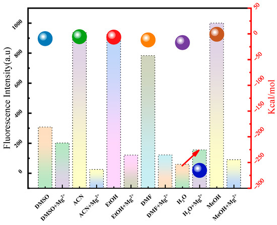 The maximum fluorescence intensity of the detection reagent in different solvents and the interaction energy between probe A and molecules in different solvents (Colored balls indicate the magnitude of the interaction energy, the red arrow indicates that the fluorescence intensity increases only in aqueous solution). (Figure S3. Fluorescence spectra of detection reagents before and after identifying Mg2+ in different solvents. Table S1. Detailed parameters in the interaction energy calculation process).