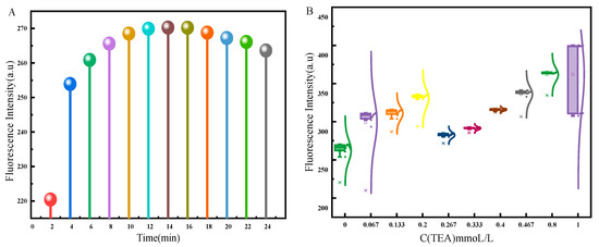 Fluorescence stability is one of the most important parameters for accurate detection [37,38]; therefore, the stability of the probe was investigated in saline. An amount of 10 μL of probe detection reagent with a concentration of 2 × 10−3 mol/L was taken and added to 3 mL of deionized water. The fluorescence spectrum of the mixed sample was scanned every 2 min and the detection was repeated 12 times. The results are shown in Figure 4A. The changing fluorescence intensity with time indicated less stability of the fluorescence signal under these conditions, which could interfere with the accurate assessment of the impurity ion during the detection process (Figure 4A). Different amounts of triethylamine were added to the above-mixed solution. The volume of triethylamine was 0, 10, 20, 30, 40, 50, 60, 70, 120, and 150 μL, and the concentration of triethylamine was 2 × 10−2 mol/L. The results are shown in Figure 4B. When the triethylamine content was 0.334 × 10−3 mol/L (the volume of triethylamine added was 50 μL), the box shape was shortest, indicating the strongest fluorescence stability. The change in fluorescence spectra under this condition is shown in Figure S7. These results suggest that triethylamine played a positive role in photostability by lowering the dielectric constant of the solvent [39]. By adding a known amount of triethylamine to the detection system, its fluorescence signal stability was maintained in the brine system, realizing accurate detection results.