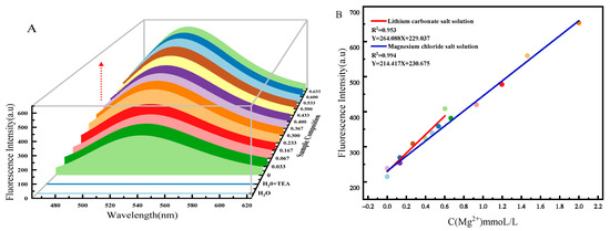 In summary, the polarity of probe A increased after hydrophilic modification before capturing Mg2+. The interaction energy with water molecules was about 62 times that before modification (Figure 2B). The stronger hydrogen bond attraction reduced the excited state lifetimes of probe A in water molecules. The rate of excited state molecule jumping was accelerated [50,51,52], the loss of externally transferred energy from probe A increased, the oxazole ring emitted fluorescence, and a strong electron-donating ability resulted in a weak fluorescence before capturing Mg2+. Figure 2 indicates that the polarity of the complex increased after capturing Mg2+ by probe A, and the interaction with the water molecules was 16 times stronger. Moreover, the complex showed weak fluorescence; however, the Mg2+ in the complex hindered the PET process on the benzoxazole ring [53]. Polar water molecules lowered the reduction potential of Mg2+ and also contributed to blocking the PET process. This double effect enhanced fluorescence, as shown in Figure 11. The fluorescence enhancement signal detected followed the Lambert–Beer law between the fluorescence intensity and the fluorescent substances concentration. The increase in Mg2+ concentration resulted in an enhanced fluorescence response. Therefore, this probe can be used to quantitatively detect trace amounts of Mg2+ impurities in lithium carbonate solutions.