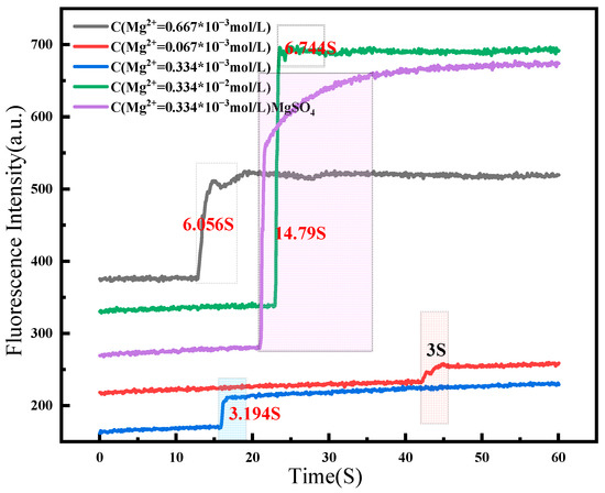 The response time indicates the detection sensitivity, and the change in fluorescence intensity with time was analyzed when the probe detected different concentrations of Mg2+ in different systems. The fluorescence intensity was plotted at the peak of the detection system’s fluorescence spectrum versus time (Figure 6). The detection time increased with Mg2+ concentration in the detection solution; however, there was no large gap, and it was completed within 3–10 s (Figure 6). The detection time increased with the Mg2+ concentration. To assess the time required for detection, the change in fluorescence intensity with time was scanned for the Mg2+ detection in lithium carbonate solution (Figure 6); the assay took only 14.790 s to detect Mg2+, confirming the fast response of the probe. Titration and response time experiments investigated the probes’ sensitivity to different concentrations of Mg2+ in saline and the speed of detection.