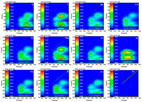 Selectivity experiments were conducted. The contour fluorescence spectra of assay reagents were compared and analyzed for the detection of different ions (ionic species Ba2+, Ca2+, K+, Li+, Al3+, Mg2+, Na+, B(OH)4−, Cs+, and Fe3+ (the concentration of each ion was 0.667 mmol/L). As shown in Figure 7, under full-wavelength excitation and emission, this method only has strong luminescent centers in the contour fluorescence spectrum when detecting Mg2+, and no luminescent centers when detecting other ions, or weak fluorescence intensity in the emission wavelength range of 480~530 nm and excitation wavelength ranges of 250~270 nm and 390~410 nm. Further, the values of the fluorescence enhancement factor were analyzed before and after adding metal ions (FEF = (Ix − Iprobe A)/IProbe A), and the results are shown in Figure 8. The detection probe showed a fluorescence-enhanced response only to Mg2+. These results were in agreement with contour fluorescence spectra graphs of the different ions recognized by the detection probe, validating that the probe could recognize Mg2+ specifically [45].
