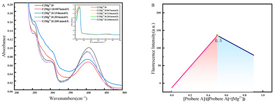 Structural changes before and after probe A recognizes Mg2+: (A) UV absorption spectrum changes before and after probe A chelates Mg2+. (B) Job’s working curve for Mg2+ detection.