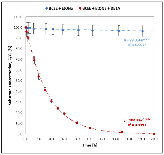 Reaction kinetics of BCEE with sodium ethoxide with and without amine (DETA).