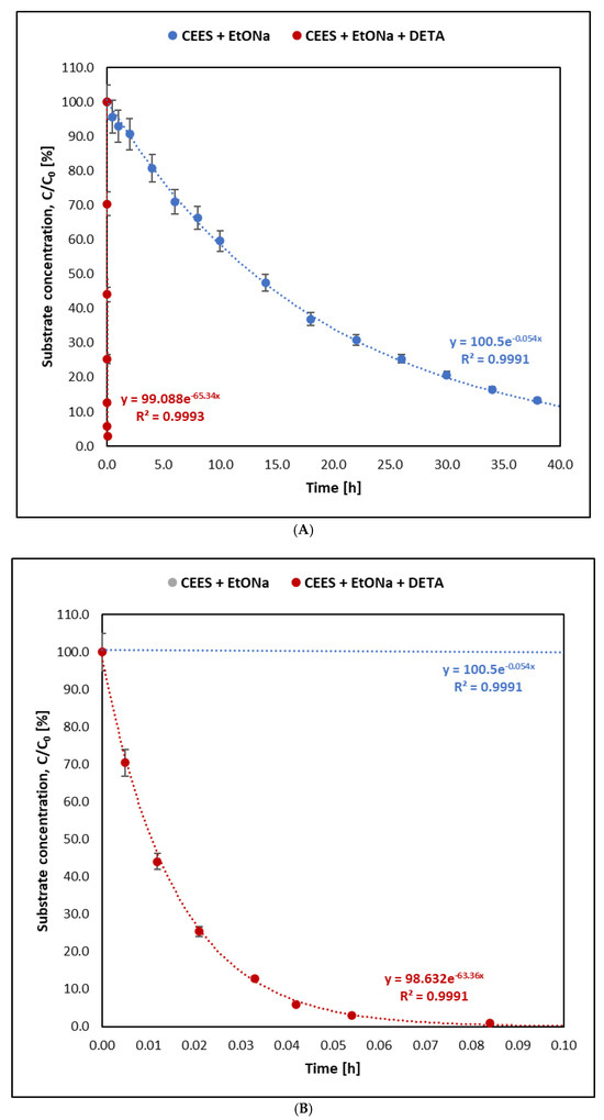 Reaction kinetics of CEES with sodium ethoxide with and without amine (DETA): (A) time range 0–40 h; (B) time range 0–0.05 h.