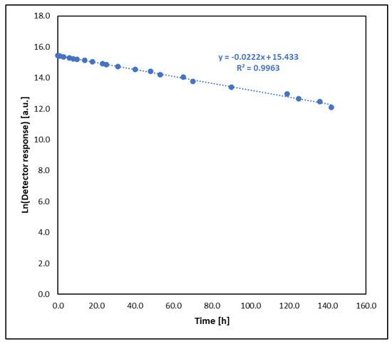 Using the graphical method and graphs of the change in the amount of the tested substances (Figure 1, Figure 2, Figure 3 and Figure 4) and their logarithmic presentation (Figure 5), it can be stated that the reactions tested are first-order reactions. On this basis, the relationship can be used to determine the half-life of the tested substances.