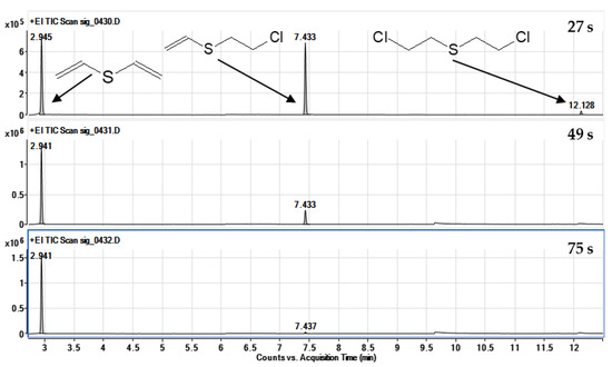 The reaction of sulfur mustard with sodium ethoxide proceeded according to the elimination mechanism. Double dehydrohalogenation occurred, and the final product of the reaction was divinyl sulfide. The reaction of mustard with the mixture of ethoxide and amine proceeded more than 120 times faster than in the case of ethoxide without adding amine. Of the samples taken from the reaction mixture within 1.5 min from the start, only the first one still contained sulfur mustard in an amount that allowed its detection by the developed method, as shown in Figure 6. The chromatograms of the remaining samples showed the intermediate product (single elimination effect) and the final product (divinyl sulfide, DVS) in various amounts. Therefore, it was impossible to determine the kinetic parameters for this reaction at a given temperature; it can only be stated that the half-time of mustard disappearance under these conditions was much shorter, 1 min.