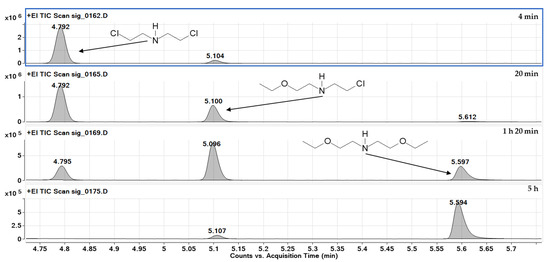 In the decontamination reaction of the tested mustards and their analogues, sulfur mustard decomposes the fastest. The half-life of mustard in the reaction with sodium ethoxide alone (without DETA) at 25 °C was 125 min, while when the decontamination solution was a mixture of sodium ethoxide and amine, the reaction was over 120 times faster. Of the samples taken from the reaction mixture within 1.5 min from the start of the reaction, only the first one still contained sulfur mustard in an amount that allowed its detection by the given method (Figure 5). Nitrogen mustard HN-3 and its selected analogue bis(2-chloroethyl)amine react at a similar rate. The half-life of HN-3 was 30.14 h, and that of bis(2-chloroethyl)amine was 22.73 h. When using the mixture containing DETA, the half-life of both compounds was shorter than 1 h. The reactions of BCEE with sodium ethoxide, both with and without the addition of amine, were the slowest compared to the reaction rates of both mustards. In the reaction with sodium ethoxide, the half-life of bis(2-chloroethyl) ether was 533 h, and in the reaction with the decontaminant containing sodium ethoxide and amine, it was about 2.5 h.
