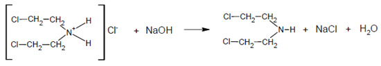 A total of 1 g of bis(2-chloroethyl)amine hydrochloride was placed in a screw-cap test tube and dissolved in 5 mL of distilled water. Then, 2.25 mL (calculated stoichiometric amount with a slight excess) of previously prepared 10% sodium hydroxide solution was added to the solution. The synthesis reaction proceeded according to the scheme in Figure 8.