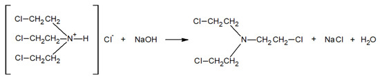 In total, 1 g of tris(2-chloroethyl)amine hydrochloride was placed in a screw-cap test tube and dissolved in 5 mL of distilled water. Following this, 1.60 mL (slight excess) of 10% NaOH solution was added to the solution, and the basic pH was confirmed using indicator paper. The synthesis reaction proceeded according to the scheme in Figure 9.