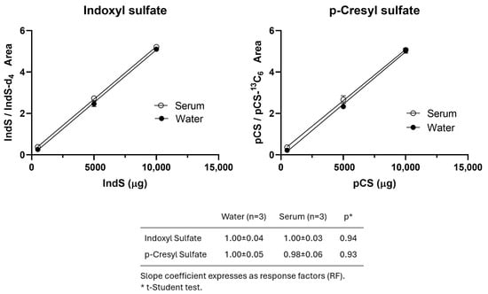 Additional validation procedures were included to assess the suitability of calibrations prepared in water to quantify serum samples. Figure 1 shows the comparison of the IndS and pCS recoveries spiked in serum samples or in water. No significant differences were observed between the slope coefficients (α) of the curves constructed in aqueous solutions and those spiked in serum. The response factors (RFs) were calculated as αspiked_serum/αwater. Utilizing RFs for the serum-spiked samples did not improve accuracy or precision, sustaining a parsimonious approach that does not necessitate compensation for different matrices.