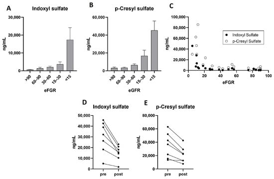 (A,B) Application of the method to measure serum indoxyl sulfate (A) and p-cresyl sulfate (B) in patients with varying estimated glomerular filtrations rates (eGFRs). (C) Correlation between serum levels of uremic toxins and eGFRs. (D,E). Application of the method to measure serum levels of indoxyl sulfate (D) and p-Cresyl sulfate (E) before and after hemodiafiltration (n = 7).