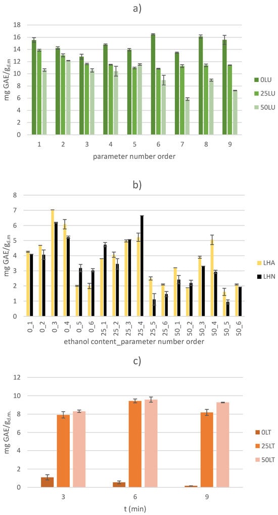 In parallel to the non-thermal extraction methods, a conventional thermal extraction method at 60 °C was also performed and the obtained TPC yields are shown graphically (Figure 1c). In general, the TPC yields obtained after thermal extraction with deionized water as the extraction solvent were significantly lower than the yields obtained with the same solvent but with non-thermal extraction methods (US and HVED). However, when ethanol solutions were used, higher yields were observed compared to the HVED-treated samples, but lower compared to US-treated samples. Ethanol content was a statistically significant variable of thermal extraction with a positive influence on the TPC yield (p < 0.05). This trend is opposite to the trends observed for US- and HVED-treated samples. The highest TPC yield of 9.58 ± 0.28 mg GAE/gd.m. was observed in the 50LT6 thermally treated sample (with 50% ethanol solution as the extraction solvent and a treatment time of 6 min), while the lowest yield of 0.16 ± 0.01 mg GAE/gd.m. was observed in the 0LT9 sample (with deionized water as the extraction solvent and a treatment time of 9 min). Considering only the 0LT thermally treated samples (with deionized water as the extraction solvent), it was found that the TPC yield decreased with longer treatments (up to 6.25 times). This is consistent with the heat sensitivity of phenolic compounds, which decompose or degrade at high temperatures and longer treatment times, leading to a decrease in TPC yield []. A decrease of 89% in the high-temperature treatment at 110 °C (compared to the treatment at 70 °C) was also observed in samples of myrtle leaves [].