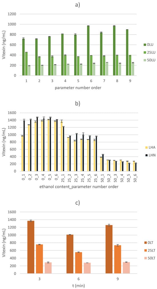 Regardless of the applied extraction method, the yield of vitexin decreases statistically significantly with increasing ethanol content (p < 0.05). Accordingly, the lowest vitexin yield was observed when a 50% ethanol solution was used as the extraction solvent. Specifically, a decrease in the vitexin yield of 2.77–5.02 times was observed in the US-treated samples, of 2.12–6.72 times for the HVED-treated samples and of 3.38–4.87 times for thermally treated samples. By optimizing the process parameters of the mentioned extractions and to achieve an optimal yield of vitexin, the ethanol content in the extraction solvent should be 0%. The obtained results correlate with the very poor solubility of the mentioned compound in ethanol and similar solvents. Due to its chemical structure (apigenin-8-C-glucoside), the flavonoid vitexin is highly soluble in organic solvents such as dimethyl sulfoxide (DMSO), but significantly less soluble in water and ethanol []. The results of vitexin yield for each extraction method are shown graphically (Figure 2).