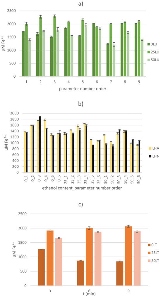 The highest AC values were found in the US-treated samples, where a range of 1677.16 ± 36.98 to 2290.50 ± 56.69 µM Fe2+ was observed depending on the applied amplitude, extraction solvent and treatment time. Although no input parameter had a statistically significant effect (p > 0.05) on the CA value of the US-treated samples, the highest values were observed when a 25% ethanol solution (extraction solvent) was used. The highest value was recorded for the 25LU3 sample, where the AC value of 2290.50 ± 56.69 µM Fe2+ was obtained with 25% ethanol solution as the extraction solvent at an amplitude of 50% over a treatment time of 6 min. The application of higher amplitudes may lead to the formation of smaller air bubbles which directly affect the extraction efficiency and reduce the efficiency due to the lower transfer of ultrasonic energy to the solvent []. Although it did not statistically significantly affect the AC value of the US-treated samples, treatment time is an important extraction factor. A longer extraction time can lead to a higher yield of compounds with AC, but too long treatment has a negative effect on it by degrading it [].