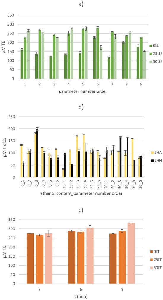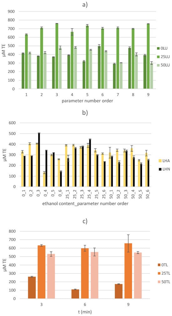 A similar range of values (109.21 ± 4.55 to 655.57 ± 103.06 µM TE) was found for the thermally treated samples. The highest AC values of 655.57 ± 103.06 µM TE were recorded in the TL25/9 sample (with 25% ethanol solution as the extraction solvent and a treatment time of 9 min) and the lowest values of 109.21 ± 4.55 µM TE were recorded in the TL0/6 sample (with deionized water as the extraction solvent and a treatment time of 6 min). The treatment time showed no statistically significant influence on the AC value (p > 0.05), but the ethanol content did (p < 0.05). As with the determination of AC by the FRAP method, the highest values of AC determined by the DPPH target in thermally treated samples were observed when a 25% ethanol solution was used as the extraction solvent. The recorded results are consistent with the research results on thermally treated (100 °C) samples of white mulberry. Namely, with a longer treatment time (from 15 to 45 min) and the application of a higher ethanol content (from 0% to 70% ethanol solution), the AC value measured by the DPPH method, expressed as radical scavenging (%), increased by 1.24 to 1.59 times [].