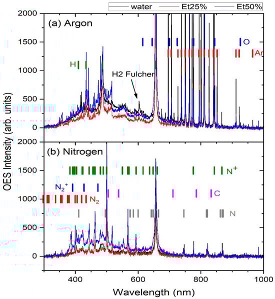 Optical emission spectra (OES) are shown in Figure 6 of (a) argon and (b) nitrogen plasma. In each case, the spectra of sugar beet leaves immersed in water (black line), 25% ethanol (red line) and 50% ethanol (blue line) during plasma treatment are shown. All of the emitted lines were identified using the NIST Atomic Spectra Database [] or consulting the literature [,,,]. In Figure 6a, the Ar plasma is shown with the dominant emission from neutral atomic argon and oxygen (the emission lines are saturated), while atomic hydrogen from the Balmer series is present with a distinctive emission line at 656 nm, ascribed to Hα. A weak molecular hydrogen emission (Fulcher band) is observed around 600 nm. Qualitatively, there are no significant differences between the spectra for water, 25% ethanol and 50% ethanol. The presence of atomic oxygen and hydrogen in all of the spectra indicates that plasma interacts mainly with the air molecules dissociating hydrogen and oxygen molecules and with the argon atoms emerging from the liquid. Figure 6b shows nitrogen plasma in which the emission of nitrogen species dominates, while atomic hydrogen is also present. It is evident that in the blue part of the spectrum emission, molecular N2 (2nd positive band) and N2+ (1st negative band) are present, while across the entire optical spectrum, atomic and ionic nitrogen is observed. Atomic hydrogen shows a clear emission at 656 nm. Again, no differences are observed between the spectra recorded for deionized water, 25% ethanol and 50% ethanol. In both cases, in argon and nitrogen plasmas, the emission of carbon, as a possible product of ethanol dissociation, was not observed. This indicates that the plasma does not interact with the ethanol in manner that decomposes the structure of the liquid.