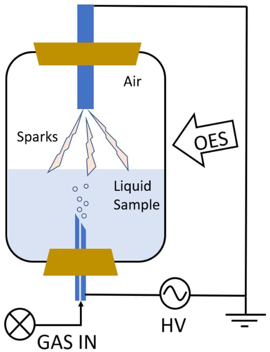 The experimental setup is shown in Figure 7. It consists of two parts: a reaction chamber and a spectrometer for optical emission spectroscopy (OES) measurement performed during the treatment of the samples. The reaction chamber is made of borosilicate glass and enables the monitoring of the emission in the optically visible part of the emission spectrum (from 350 nm onwards). The chamber consists of two electrodes; the upper one is grounded; the lower one has an opening for the gas inlet (argon or nitrogen) and is immersed in water. The latter is connected to a bias voltage of 20 kV at 100 Hz (Impel group d.o.o., Zagreb, Croatia). The gas flow is controlled and optimized with a flow meter (0.75 L/min).