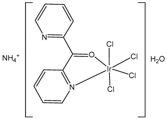 In the study of [22], Masternak et al. recently obtained and characterized, by FTIR, 1H-, 13C-, 15N-NMR, UV–Vis, PL and elemental analysis, the octahedral complex NH4[IrCl4(py2CO)]·H2O (Figure 3), based on di-2-pyridylketone (py2CO). The compound was examined in vitro against LoVo (colorectal adenoma), MV-4-11 (myelomonocytic leukemia), MCF-7 (breast adenocarcinoma), and BALB/3T3 (normal fibroblasts) cells. The best results were obtained against MV-4-11 (IC50 = 35.8 ± 13.9 µg/mL) without toxic effects against normal BALB/3T3 cells, which pointed towards its selectivity as a potential antitumor agent. It has been suggested that this complex induced the probable formation of covalent bonds with DNA. Furthermore, the obtained tetrachloridoiridium(III) complex induced ROS, which, in synergy with hydrolysis promoting DNA bonding, could lead to cancer cell death. Furthermore, the biocatalytic activity of the complex against NADH (β-nicotinamide adenine dinucleotide disodium salt hydrate) has been determined. The complex exhibited a strong ability to interfere with the coenzyme NAD+/NADH, which is coupled to the induction of ROS in cells, consistent with the antineoplastic activity. According to the obtained data, the antiproliferative activity of the studied tetrachloridoiridium(III) complex has been derived from the synergistic effects of the hydrolysis and the oxidation–reduction reactions, generating ROS.