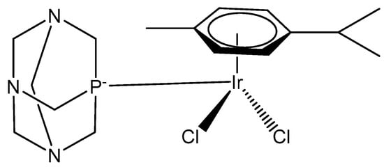 The dichloridoiridium(III) half-sandwich complex [(η5-C5Me5)IrCl2(pta)] of phosphine 1,3,5-triaza-7-phosphatricyclo[3.3.1.1] decane (pta), Figure 9, has been screened against a range of human tumor cell lines [31,32]. The complex is an analog of the antimetastatic agent [(η6-cymene)RuCl2(pta)] (RAPTA-C).