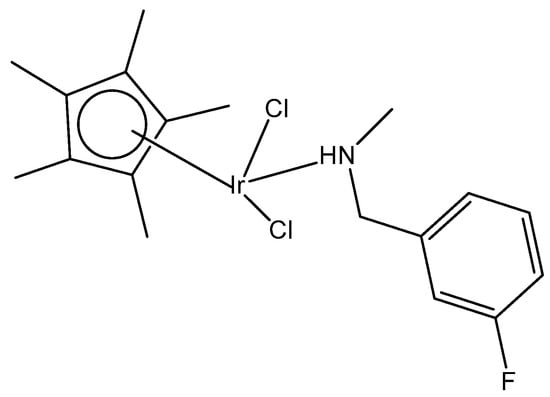 A half-sandwich dichloridoiridium(III) complex, containing secondary amine 3-fluoro-N-methylbenzylamine as the N-monodentate ligand, has been obtained by the reaction of one equivalent of [(η5-Cp*)IrCl2]2 (Cp* = pentamethylcyclopentadienyl) with two equivalents of 3-fluoro-N-methylbenzylamine in very good yield [39]. The structure of the dichloridoiridium complex (Figure 10) has been confirmed by X-ray crystallography, 1H-NMR, 13C-NMR spectroscopy, and elemental analysis. The obtained complex adopted a piano-stool configuration, with Cp* acting as the seat and 3-fluoro-N-methylbenzylamine ligand and chloride groups as the legs. The cyclometallation reaction of iridium(III) complexes could occur when tertiary amines were employed [40]. As a result, it seemed that the production of monoligated complexes in this system was ascribed to the small size of the secondary amines compared to tertiary amines.