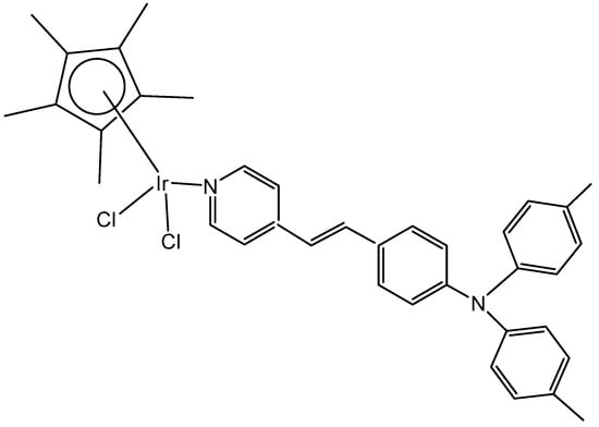 A series of half-sandwich Ir(III) complexes with triphenylamine-modified pyridines, used as a monodentate N-donor ligands, have been projected to act as luminescent agents for the intracellular tracking studies [49]. Ten triphenylamine-modified fluorescent half-sandwich dichloridoiridium(III) pyridine complexes with the general formula {[(η5-Cpx)Ir(L)Cl2]} have been prepared and found to display potential antiproliferative action, effectively inhibiting the A549 cell migration. The most active complex (Figure 13) showed moderate cytotoxic activity (IC50 = 26.7 μM in A549 cells) but exhibited excellent fluorescence performance in solution (15.2% quantum yield), allowing innovative in vitro and in vivo biological studies. Additionally, this dichloridoiridium(III) compound was able to arrest the cell cycle at the G2/M phase, catalyze NADH oxidation, reduce the mitochondrial membrane potential, induce an increase in the intracellular ROS levels, and exhibit a mechanism of oxidation. An in vivo anticancer assay confirmed that the dichloridoiridium(III) complex (Figure 13) was safer than the classical drug cisplatin.