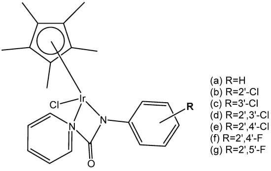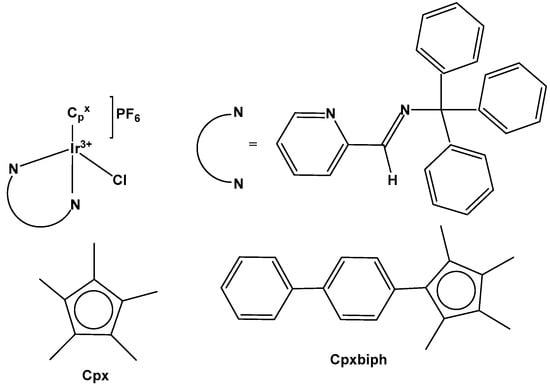 - Liu, Z.; Habtemariam, A.; Pizarro, A.M.; Clarkson, G.J.; Sadler, P.J. Organometallic iridium (III) cyclopentadienyl anticancer complexes containing C, N-chelating ligands. Organometallics 2011, 30, 4702–4710. [Google Scholar] [CrossRef]