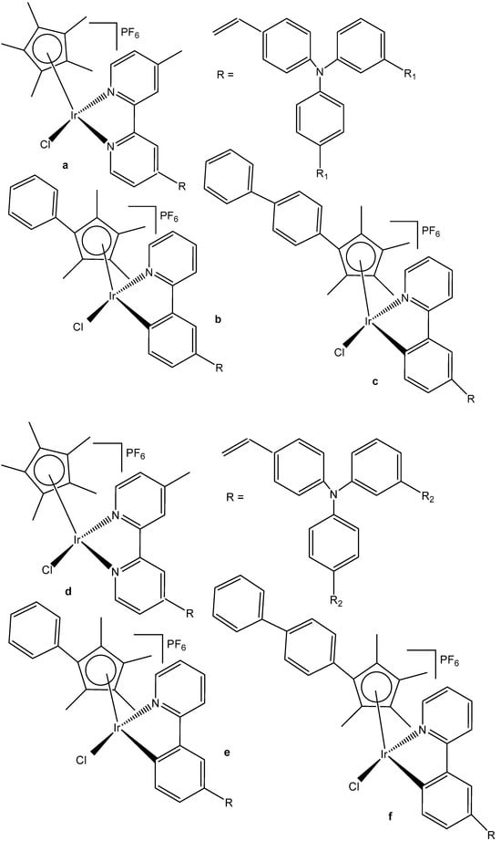 - He, X.; Tian, M.; Liu, X.; Tang, Y.; Shao, C.; Gong, P. Triphenylamine-appended half-sandwich iridium(III) complexes and their biological applications. Chem. Asian J. 2018, 13, 1500–1509. [Google Scholar] [CrossRef] [PubMed]