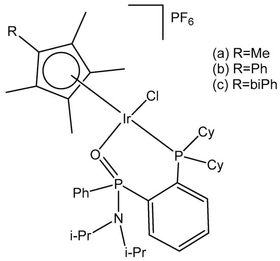 Complexes (η5-C5Me5)Ir(III), containing Ph2P(CH2)nS(O)xPh (n = 1–3; x = 0–2) with κP- and κP,κS-coordination (Figure 11) and their high antitumor potential in a low µM range, have been described by Ludwig et al. [41]. The complexes with κP- and κP,κS-Ph2P(CH2)nS(O)xPh ligands have been found to be more active compared to cisplatin against tumor cell lines from different origins, such as A253, 518A2, SW480, 8505C and MCF-7, showing apoptotic induction.
