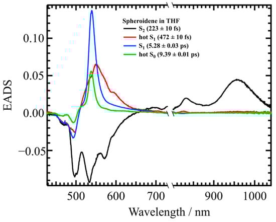 For the further analysis shown in Section 3, it is essential to determine the lifetimes of the excited carotenoid species independent of EET to Bchl a. To achieve this, transient absorption spectra of spheroidene in tetrahydrofuran (THF) were analyzed. Figure 5 shows the EADS results for spheroidene in THF, obtained using a four-component sequential model. Based on these results, a more refined target model, as illustrated in each panel of Figure 6, is developed.
