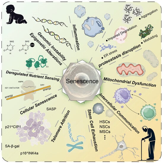 Aging is a universal natural phenomenon, and anti-aging therapies have consistently been a focal point of research throughout history. From a healthcare perspective, aging can increase the prevalence of diseases such as cardiovascular disease, neurodegenerative diseases, and metabolic disorders [1]. This complex process encompasses interconnected mechanisms, including genomic instability, telomere depletion, epigenetic changes, proteostasis disruption, mitochondrial dysfunction, nutrient-sensing impairments, cellular senescence, and persistent inflammation (Figure 1) [2,3]. These pathways collectively drive the decline in resilience and the onset of age-related diseases (ARDs).