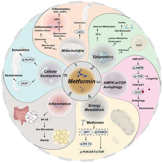 - Metformin senses intracellular ATP/AMP ratios, activating the AMPK and inhibiting the mTOR pathways to delay aging [35]. It induces mTOR inhibition and PI3K/AKT activation, resulting in ULK1 dephosphorylation, autophagy induction, and aging mitigation [37];