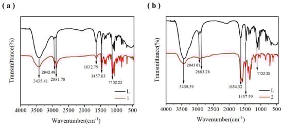 We characterized compounds 1–5 using infrared spectroscopy to analyze the characteristic functional group absorption peaks of the compounds. Taking compound 1 as an example, as shown in Figure 7, the ligand L synthesized experimentally was hygroscopic, as evidenced by the peak at 3435.41 cm−1 in the infrared spectrum. The peaks at 2942.49 cm−1 and 2881.78 cm−1 correspond to the stretching vibration peaks of -CH2- in the structure of ligand L. The absorption peak at 1632.79 cm−1 is attributed to the stretching vibration of C-N bonds, while the peak at 1457.03 cm−1 corresponds to the bending vibration of C-H bonds, and the peak at 1132.22 cm−1 is attributed to the stretching vibration of C-O bonds. These results are consistent with single crystal X-ray test results.
