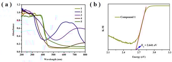 (a) Solid UV spectrum of compounds 1–5. (b) band gap energy calculations of compound 1. (c) band gap energy calculations of compound 2. (d) band gap energy calculations of compound 3. (e) band gap energy calculations of compound 4. (f) band gap energy calculations of compound 5.