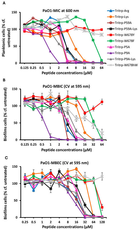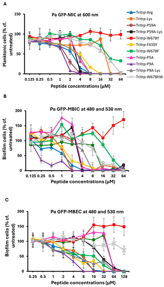 In studies with several peptides, it has been observed that some AMPs can display antibiofilm activities at concentrations that are lower than their MIC values, which represents the concentration of an AMP required to kill planktonic cells (see, for example, [11,70]). Indeed, in their early studies, Overhage et al. demonstrated that LL37 and indolicidin both displayed such antibiofilm activities, while several other known AMPs did not show any activity, revealing that such effects are highly peptide-specific. Also, in our current work, we see such concentration effects, for example, comparison of the MIC and MBIC’s curves for Tritrp-P9A in Figure 1 and Figure 4 show that the latter curve is shifted to lower peptide concentrations. Likewise, in Figure 2, the shape of the curve for the MBEC suggests that more than half of the cells are already removed at a concentration of 4 uMol/L, which is below the MIC value. However, removing the remaining cells requires substantially higher peptide concentrations, suggesting that not all biofilm-entrapped bacteria in our MBEC assays are equally accessible to the AMPs.