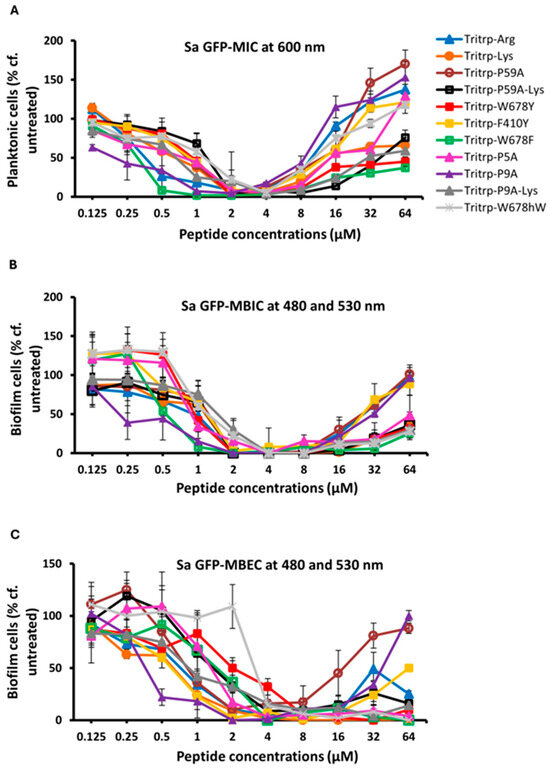 The MIC (A), MBIC (B) and MBEC (C) values for the tritrpticin analog peptides were assessed against Sa GFP. The MIC values were determined by measuring the absorbance of bacterial cells at 600 nm. The MBIC and MBEC values were determined by recording the fluorescence at 480 nm and 530 nm from the biofilms of GFP-expressing Sa. Three biological replicates were run for each test sample, and the mean was calculated for the recorded absorption or fluorescence values. In the graphs, the error bars represent the standard deviation (±SD).