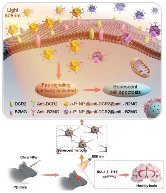 Furthermore, chiral gold nanomaterials have also been applied in the treatment of PD. Xu et al. showed that chiral Au nanoparticles can selectively eliminate senescent microglia in a mouse model of PD, thereby ameliorating symptoms associated with age-related neurodegenerative conditions (Figure 8) [57]. Specifically, L-AuNPs exhibited higher clearance efficiency of senescent cells in vitro compared to D-AuNPs, without harming normal cells. Mechanistic studies revealed that chiral NPs mediated the apoptosis of senescent cells through the activation of the Fas signaling pathway. In PD mouse models, L-AuNPs effectively cleared senescent microglia in the brain upon light irradiation, reducing the levels of α-synuclein in the cerebrospinal fluid. Additionally, mice treated with L-AuNPs showed significant improvements in motor function and spatial memory tests, indicating the potential therapeutic efficacy of this treatment strategy for PD.