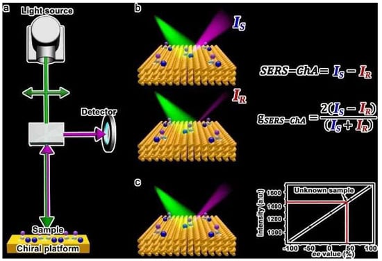 Schematic depiction of the SERS-ChA technique for distinguishing enantiomers. (a) Conventional Raman scattering equipment with a chiral platform. (b) SERS-ChA and g-factor are obtained for enantiomers. (c) Absolute configurations and ee (enantiomeric excess) values of unknown samples can be obtained from the calibration curves [68]. IS represents the SERS intensity corresponding to the signal from the S-enantiomer, while IR represents the SERS intensity from the R-enantiomer.