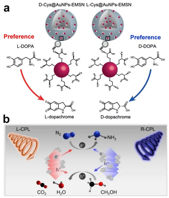 (a) Schematic illustration of enantioselective oxidation of chiral DOPA by d-Cys/l-Cys@AuNPs-EMSN [74]. (b) Schematic illustration of nitrogen fixation by chiral L/D-Au@CeO2 helical nanorods (HNRs) under CPL illumination [75].