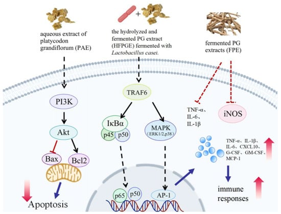The processing method of Platycodonis radix may affect the effects of PG. Baihezhijiegeng is derived from processed Platycodonis radix. Baihezhijiegeng administration significantly decreases IL-1β, IL-6, TNF-α, and matrix metalloproteinase 9 expression; decreases IFN-γ levels; increases IL-4 and IL-10 expression; and improves the pathological condition of the lungs in rats with chronic obstructive pulmonary disease [96]. Fermented PG extract increases NF-κB levels and modulates the expression of NO and proinflammatory cytokines [97].